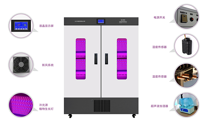 ● 微电脑程序控制温度、气候度,可模拟白天及黑夜的温度、湿度变化,也可选择生长环境充足稳定的光源。