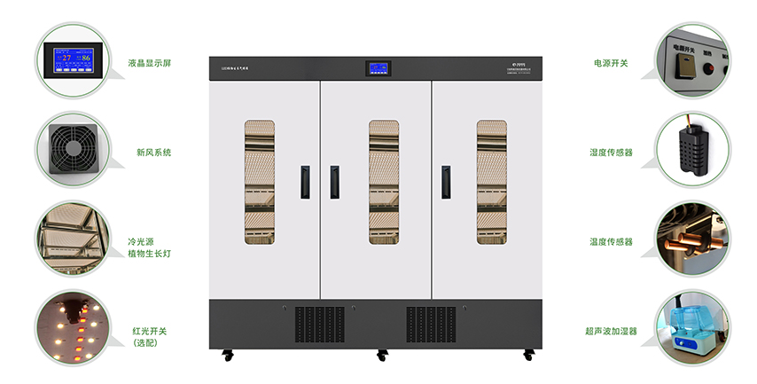 ● 微电脑程序控制温度、湿度、光照度,可模拟白天及黑夜的温度、湿度变化,也可选择生长环境充足稳定的光源。